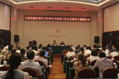 7月30日上午,民进常德市委学习宣传中央统战工作会议精神专题报告会在新亚柳叶国际大酒店举行,全市在职会员参加会议。民进常德市委主委、常德汽车机电学校校长张力主持会议。