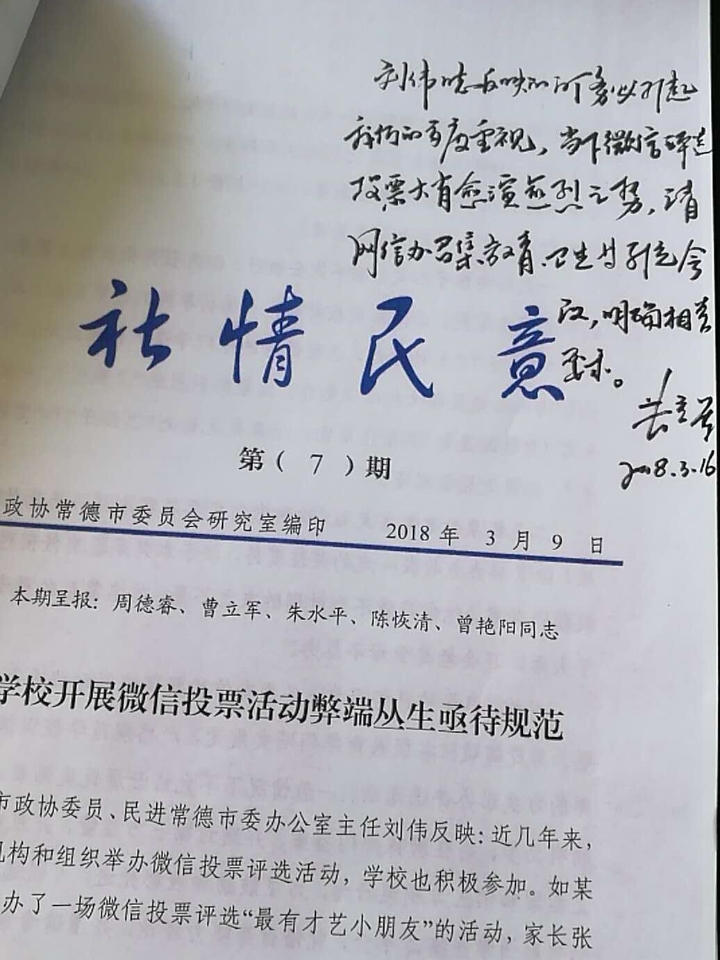 “刘伟同志反映的问题务必引起我们的高度重视,当下微信评选投票大有愈演愈烈之势,请网信办召集教育、卫生等系统会议,明确相关要求”。中共常德市委副书记、市人民政府市长曹立军在社情民意《学校开展微信投票活动弊端丛生亟待规范》进行了上述批示。